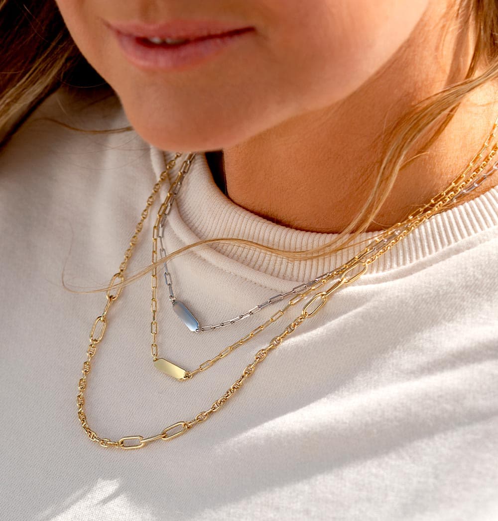 Het is al een tijdje hot: het layeren van je kettingen. Het idee is simpel: draag meerdere kettingen om je hals voor een trendy look. De kettingen hebben verschillende lengtes waardoor ze allemaal mooi zichtbaar zijn op je hals. In deze blog nemen we je mee in de wereld van kettingen layeren. Hoe combineren we meerdere kettingen? En wat zijn dan de goede lengtes voor je kettingen?