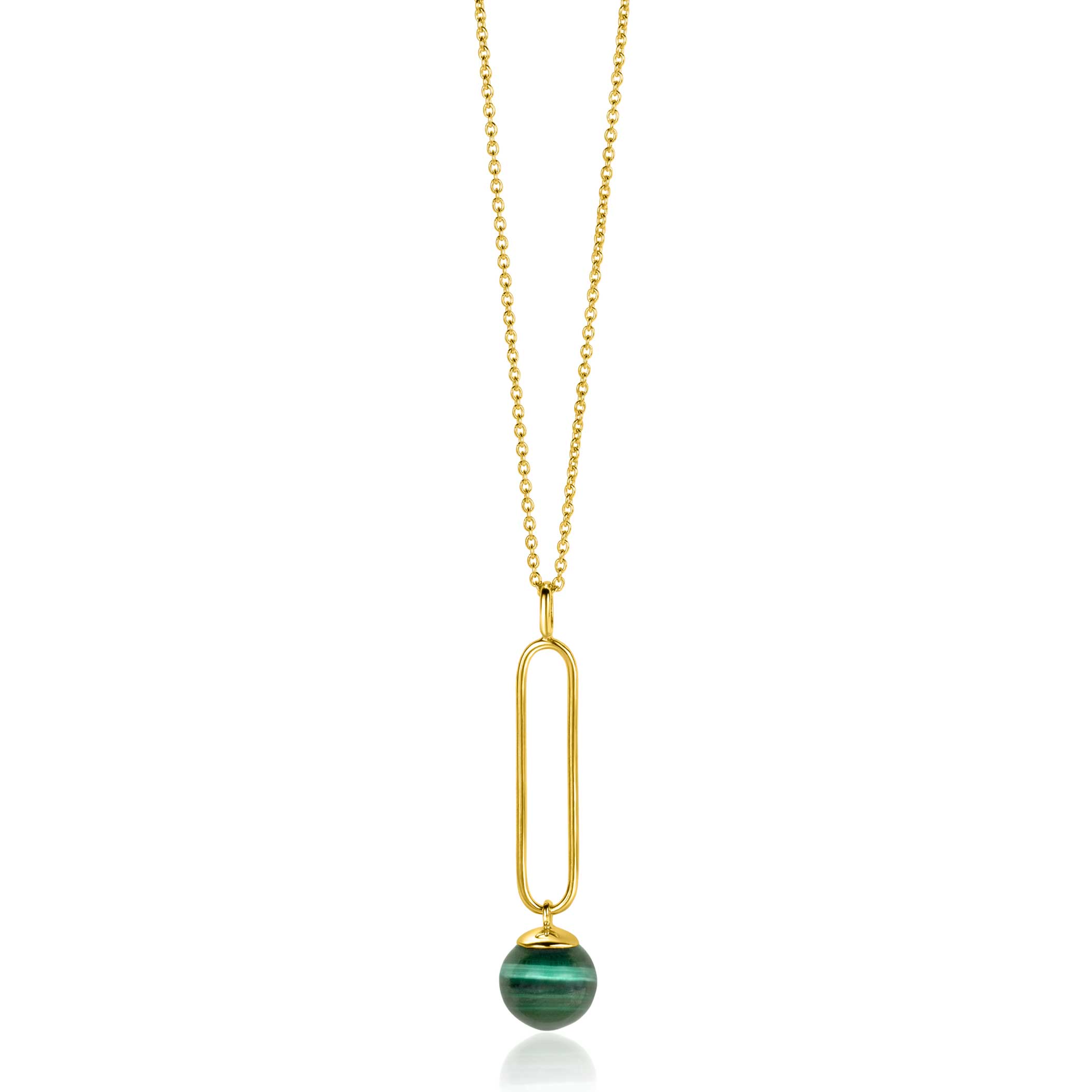 ZINZI gold plated zilveren ketting inclusief hanger met lange paperclip schakel en bungelende groene cateye in bolvorm. Een sierlijke ketting voor om iedere hals! De lengte van deze ketting is te variëren tussen 40 en 45cm. Met herkenbaar Zinzi hartje bij de sluiting. De ketting is vervaardigd van eerste gehalte zilver (925) en voorzien van een extra geel vergulding.