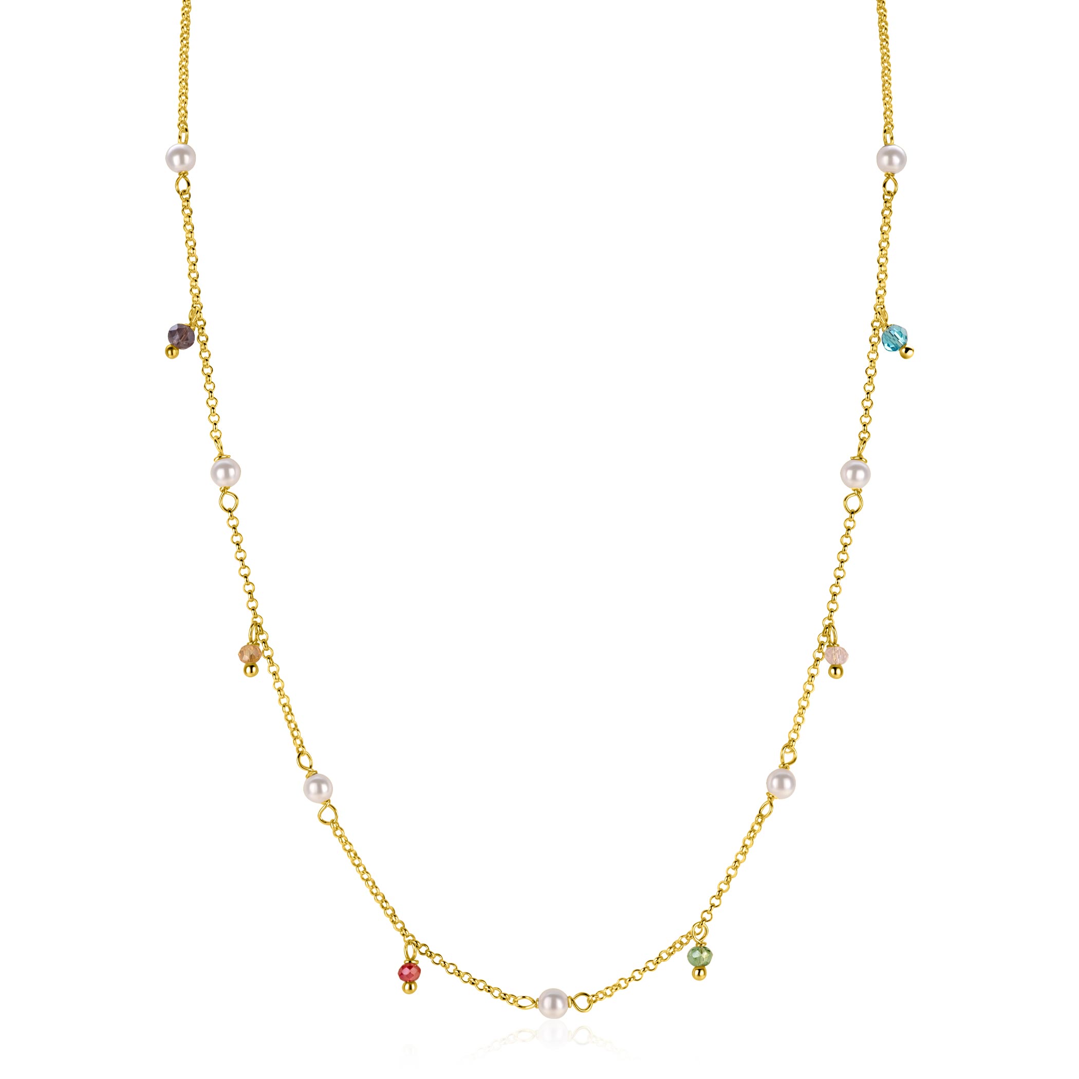 ZINZI gold plated zilveren ketting met afwisselend witte parels en bungelende facetgeslepen beads (5,5mm) in frisse kleuren. De ketting is verstelbaar van 42cm tot 45cm. Vervaardigd van eerste gehalte zilver (925) en extra geel verguld.