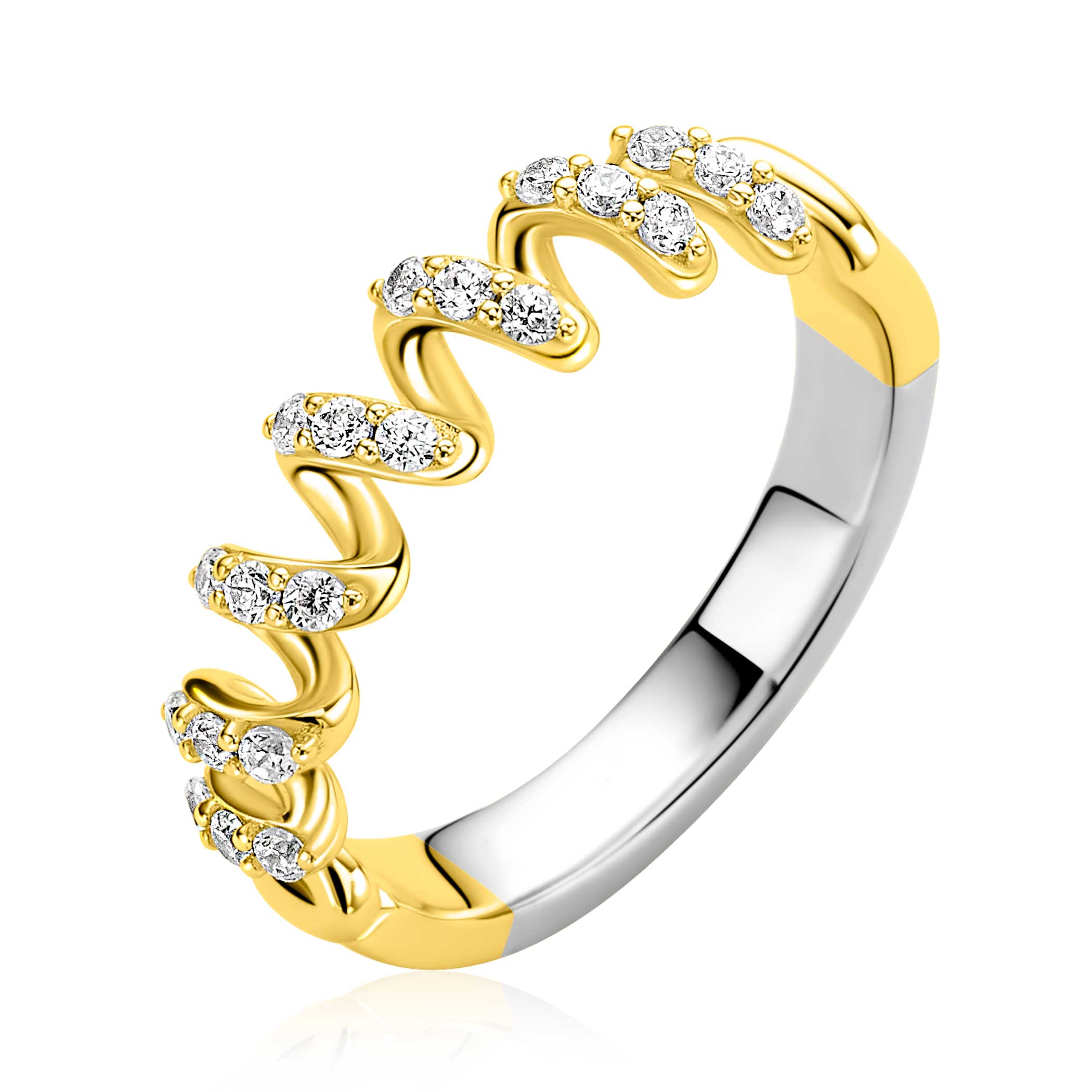 ZINZI gold plated zilveren ring met een sierlijk golvend design, bezet met witte zirkonia’s in verfijnde zetting ZIR2877Y