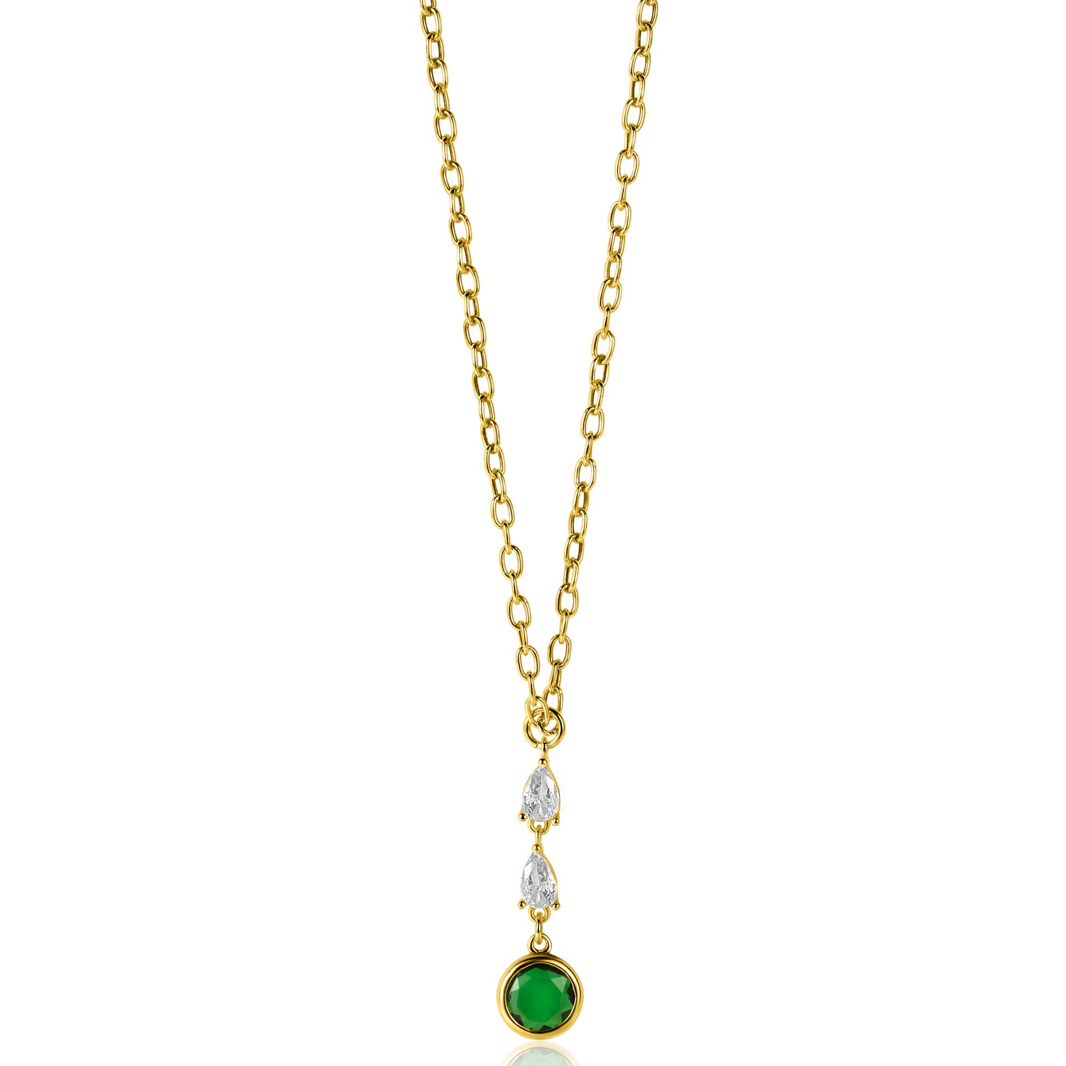 ZINZI gold plated zilveren schakelketting met hanger (31mm) bezet met twee peervormige witte zirconia's en een ronde groene kleursteen 40-45cm ZIC-BF69G
