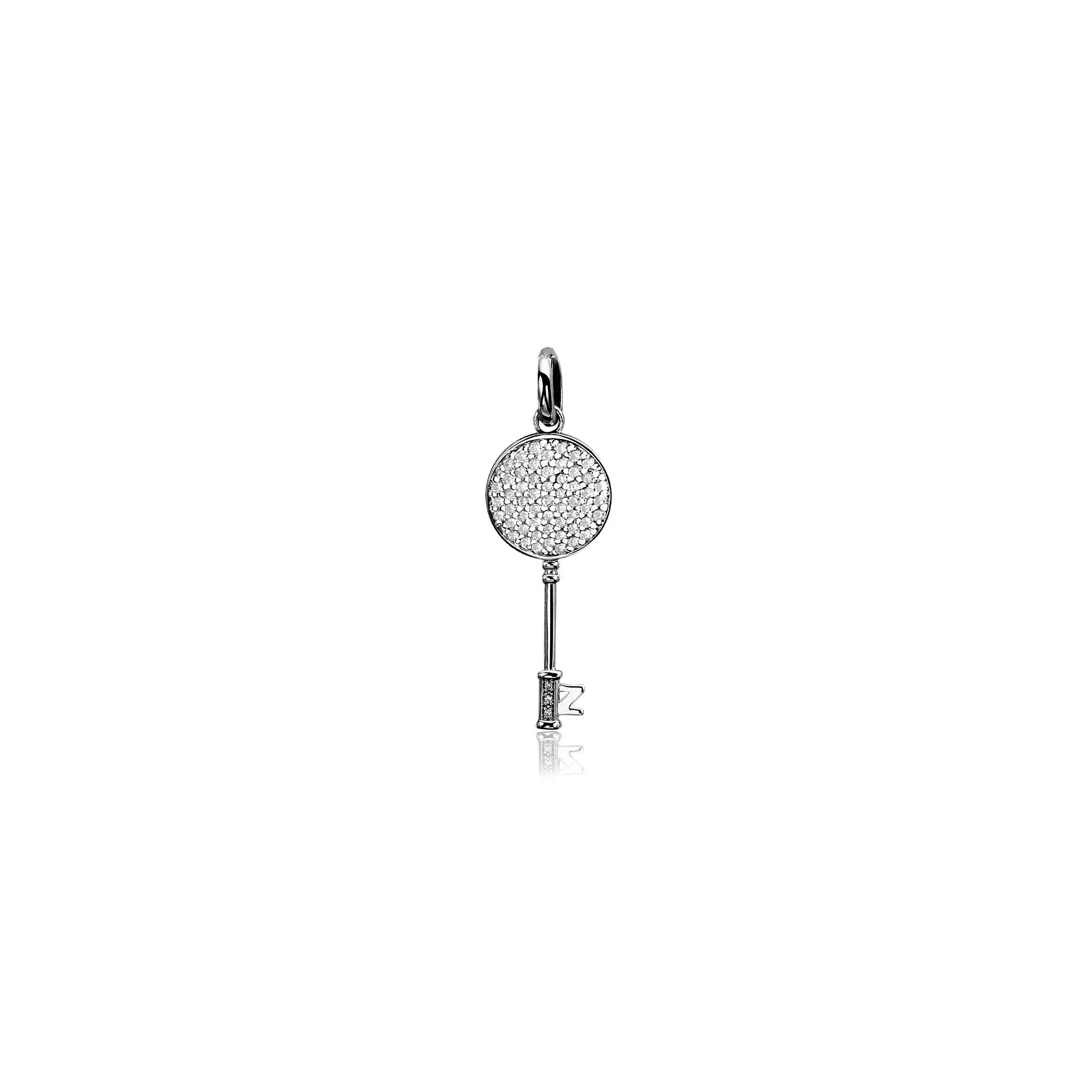 ZINZI zilveren hanger in de vorm van een sleutel. De gehele boven zijde is bezet met witte zirconia's en op de onderkant zitten ook nog 3 zirkonia steentjes. De hanger is vervaardigd van eerste gehalte zilver (925) en is voorzien van een extra rodiumlaag voor een langdurige glans. Het collier is niet bij de prijs inbegrepen.